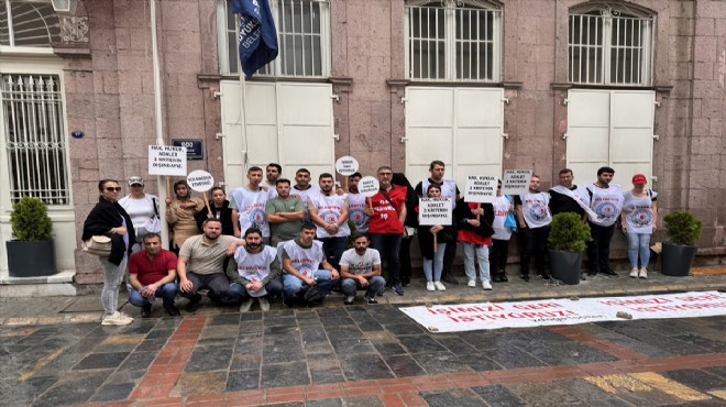 İzmir Büyükşehir Belediyesi Egemenlik Binası önünde toplanan işçiler, dün başlattıkları eylemi bugün de sürdürdü.