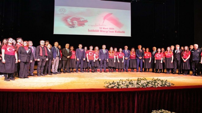 İzmir İl Millî Eğitim Müdürlüğü tarafından Dokuz Eylül Üniversitesi Sabancı Kültür Merkezi’nde düzenlenen törene Süleyman Elban, Ömer Yahşi, il protokolü, eğitim yöneticileri, öğretmenler ve öğrenciler katıldı. Program, saygı duruşunun ardından Işılay Saygın Güzel Sanatlar Lisesi Orkestrası eşliğinde İstiklâl Marşı’nın okunmasıyla başladı. Programda, Mehmet Âkif Ersoy’un hayatı ve Türk milletinin bağımsızlık mücadelesine ilişkin sinevizyon gösterimi de izletildi. İzmir Milletvekili Tamer Osmanağaoğlu’nun günün anlam ve önemine ilişkin telgrafı okundu.