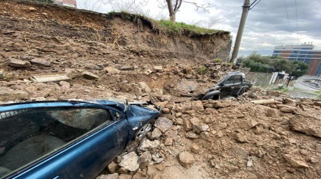 İzmir'in Bayraklı ilçesi 1610 Sokak'taki bir sitenin istinat duvarı sağanak yağmur nedeniyle çöktü. Çöken istinat duvarının enkazı altında kalan park halindeki 4 otomobilde büyük oranda maddi hasar meydana geldi. Otomobil sahiplerinden Sezai Aydın, "Gece çok kuvvetli yağmur yağdı. Yağmur nedeniyle akan sular, istinat duvarının yıkılmasına neden oldu. Saat 06.30 sıralarında duvar yıkılmış. Yarım saat sonra ise biz otomobilin yanına geldik. Otomobilimiz çekici yardımı ile buradan kaldırılacak. En az 20 bin TL'lik bir hasar olduğunu düşünüyoruz. Yapacak bir şey yok. Allah başka keder vermesin" dedi.