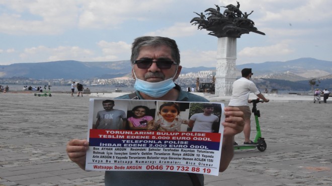 Ayhan Akgün, üzerinde torunlarının ve yeğenlerinin fotoğraflarının olduğu afişler bastırarak, İzmir'de sokakları dolaşıp, halkın yoğun olduğu yerlere yapıştırıyor. Dede Akgün, torunlarının yerini bildiren kişiye 2 bin euro, polise teslim eden kişiye ise 5 bin euro ödül vereceğini söyledi. Akgün, torunlarının bulunması için koyduğu bu ödüle astığı afişlerde de yer verdi.