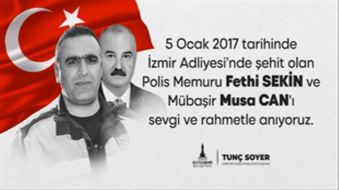 İzmirliler, İzmir Adliyesi’nin önünde yedi yıl önceki terör saldırısında şehit olan polis memuru Fethi Sekin ve mübaşir Musa Can’ı unutmadı. 5 Ocak 2017’de Adliye’ye yönelik terör saldırısında olası faciayı canı pahasına engelleyen şehit polis memuru Fethi Sekin ile kurşunların isabet etmesi sonucu şehit olan mübaşir Musa Can için İzmir Adliyesi’nde yarın anma töreni düzenlenecek.