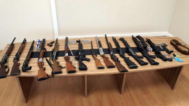 İzmir Emniyet Müdürlüğü ekipleri, bugün sabah 06.30'da, Karşıyaka'da çeşitli suçlara karıştığı tespit edilen şüphelilerin kaldığı 50 farklı adrese eşzamanlı operasyon düzenledi. Adreslerde yapılan aramalarda, 2 ruhsatsız tabanca ve bu tabancalara ait 47 mermi, 2 kurusıkı tabanca, 14 ruhsatsız av tüfeği ve bu tüfeklere ait 67 fişek ile bir kama tabir edilen bıçak ele geçirildi.