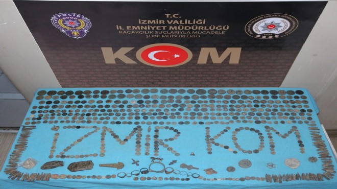 İzmir Emniyet Müdürlüğü Kaçakçılık Suçlarıyla Mücadele Şube Müdürlüğü ekipleri, Manisa'nın Kula ilçesinde park halindeki bir minibüste kaçak tarihi eserler bulunduğu bilgisi üzerine harekete geçti. Söz konusu minibüse operasyon düzenleyen ekipler; Lidya, İyonya, Roma, Bizans ve çeşitli İslam devletlerine ait 84 bronz ok ucu, üzerinde farklı figürler bulunan 526 bronz ve gümüş sikke, 3 elektron sikke (altın ve gümüş alaşımı), 9 gümüş ve bronz yüzük, 1 bronz bileklik, aslan tasvirli 1 bronz takı parçası, yılanbaşı tasviri olan 1 bronz takı parçası, 1 bronz kemer tokası, 1 bronz anahtar, haç şeklinde 1 küçük gümüş kolye ucu, farklı ebatlarda ve şekillerde, bazı parçaları eksik ve kırık olan 44 metal obje ele geçirdi. Ellerindeki tarihi eserleri yaklaşık 2 milyon TL'ye satma hazırlığındayken yakalandıkları belirlenen A.Y. ve A.Y. gözaltına alındı. İki şüphelinin polisteki işlemlerinin sürdüğü öğrenildi. (DHA)