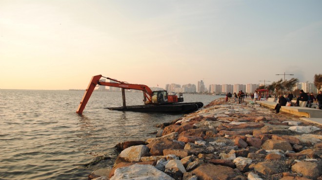 Deniz yüzeyinde futbol sahasını anımsatan bu görüntü, birkaç gün sonra beyazlaşmaya başladı. Uzmanlar, bunun deniz marulundaki canlıların ölmeye başlamasından kaynaklandığını, kısa sürede temizlenmemesi durumunda hem kötü kokuya, hem de deniz altındaki canlıların ölümüne neden olacağını vurguladı. Bu uyarının hemen ardından çalışmalar hızlandırıldı. İzmir Büyükşehir Belediyesi'ne bağlı ekipler özel kepçeyle deniz marulundan tamamen temizledi. Bir iş makinesinin detaylı temizlik için suda çalıştığı görüldü. (DHA)