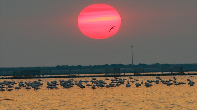 Zengin yaşam kaynaklarıyla yaklaşık 300 kuş türüne ev sahipliği yapan İzmir Kuş Cenneti'nde yavrulama dönemine geçen flamingoların gün batımında kuluçka adasına dönmeleri görsel şölen oluşturuyor.