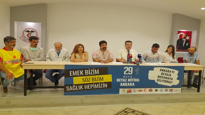 Türk Tabipleri Birliği (TTB) tarafından 29 Mayıs’ta Ankara’da sağlık çalışanlarının özlük haklarının düzenlenmesi, yaşanan mağduriyetlerin giderilmesi amacıyla Beyaz Miting düzenlenecek. Mitinge sayılı günler kala İzmir Tabip Odası “Emek bizim söz bizim; sağlık hepimizin!” başlıklı bir basın açıklaması gerçekleştirdi. Açıklamaya İzmir Tabip Odası, Manisa Tabip Odası, Aydın Tabip Odası, İzmir Diş Hekimleri Odası, Sağlık Emekçileri Sendikası, Birinci Basamak Birlik Ve Dayanışma Sendikası, Genel Sağlık İş, Dev Sağlık İş, Tarım Orkam Sen, İZAHED, Sosyal Hizmet Uzmanları Derneği, TÜMRAD-DER, Belediye Veteriner Hekimler Derneği temsilcileri katıldı. Beyaz Miting’de buluşma çağrısı yapan İzmir Tabip Odası’nın açıklamasında, “Mesleğimiz, sağlığımız alarm veriyor. Ama değiştirme, dönüştürme, geri alma şansımız var. Gelin birlikte dur diyelim, değiştirelim” denildi.