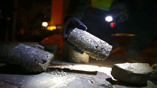 İzmir'de yaşanan depremin ardından bölgede çalışmalara başlayan Çevre ve Şehircilik Bakanlığı Yapı İşleri Genel Müdürlüğü ekipleri, tespit ettikleri öncelik taşıyan binaların kolon ve kirişlerinden beton örnekleri alıyor.
