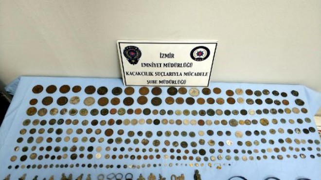 Kaçakçılık Suçlarıyla Mücadele Şube Müdürlüğü, Kültür ve Tabiat Varlıkları Kaçakçılığı Büro Amirliği ekipleri, E.H.'nin Çiğli ilçesindeki evinde çok sayıda tarihi eser sakladığı bilgisi üzerine harekete geçti. Belirlenen adrese operasyon düzenleyen ekipler, Roma, Bizans ve çeşitli İslam devletlerinin dönemlerine ait 300 sikke, 9 bronz mühür, 4 yüzük, 3 bileklik, 4 kolye ucu, 4 altın takı parçası ve metal heykelcik ele geçirdi. Gözaltına alınan E.H., emniyetteki ifadesinin ardından serbest bırakıldı. Hakkında açılan soruşturma dosyası ise savcılığa gönderildi. (DHA)