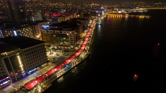 İzmir Büyükşehir Belediyesince düzenlenen programa katılan İzmirliler, bir alışveriş merkezi önünde açılan Türk bayrağını, Cumhuriyet Meydanı'nda başlayan fener alayıyla Gündoğdu Meydanı'na kadar taşıdı.