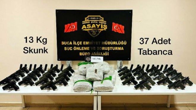 Buca ilçe Emniyet Müdürlüğü ekipleri, silah ve uyuşturucu madde ticareti yapan kişilere yönelik sürdürdüğü çalışmanın ardından dün operasyon düzenlendi. İlçedeki bir işyeri, depo ve eve eş zamanlı düzenlenen operasyonlarda, ruhsatsız 37 tabanca, bu tabancalar ait şarjör ve 13 kilo uyuşturucu madde skunk ele geçirildi. Olayla ilgili M.Y. ve M.Ç. gözaltına alındı. Gözaltına alınan 2 şüphelinin polisteki işlemlerinin sürdüğü bildirildi. (DHA)