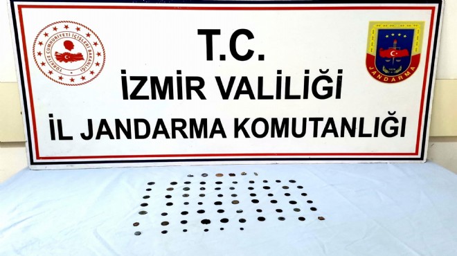 Bornova ilçesinde jandarmanın arama yaptığı otomobilde Osmanlı, Roma ve Bizans dönemlerine ait 65 sikke ve 7 obje ele geçirildi; 2 kişi gözaltına alındı.