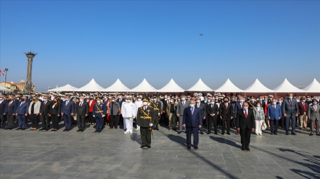 İzmir Cumhuriyet Meydanı'ndaki törende, saygı duruşu ve İstiklal Marşı'nın okunmasının ardından Vali Yavuz Selim Köşger, Ege Ordusu ve Garnizon Komutanı Orgeneral Ali Sivri ile Büyükşehir Belediye Başkanı Tunç Soyer tarafından Atatürk Anıtı'na çelenk sunuldu.