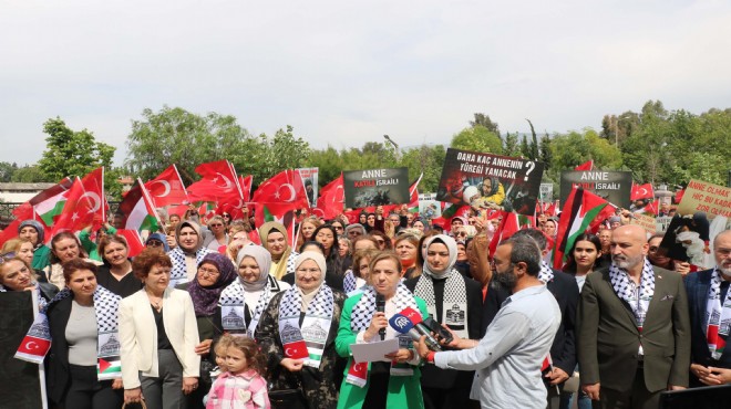 "Ateşkes için bir adım bekliyoruz. İsrailli yetkililere soruyorum: Vadedilmiş topraklar hedefinizi, hayattan kopardığınız annelerin ve çocukların bedenleri üzerine mi inşa edeceksiniz? Bizler bugün AK Parti İzmir İl Kadın Kolları Başkanlığı, teşkilatlarımız, sivil toplum kuruluşu temsilcileri olarak buradayız. Şu an 81 ilde AK Partili kadınlar olarak Gazzeli anneler için dimdik ayaktayız. Yaşanan tüm zulme, acıya rağmen eşini, evladını, ailesini kaybetmesine rağmen çocukları için, ülkesi için dimdik ayakta duran Filistinli anneler, er ya da geç kazanacak. Anneler bitmeden bu direniş bitmez. Kalbi Gazzeli anneler için çarpan kadınlar olarak haykırıyoruz; 'Bu zulüm daha ne kadar sürecek? Yeter artık İsrail, kanlı ellerini sivillerin, annelerin, çocukların üzerinden çek."(DHA)