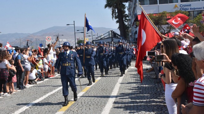 İzmir Valisi Ayyıldız, Ege Ordusu ve Garnizon Komutanı Orgeneral Abdullah Recep ile İzmir Büyükşehir Belediye Başkanı Tunç Soyer, törene katılanların bayramını kutlayacak. Saat 11.00'de geçit töreni başlayacak. Ege Ordusu ve Garnizon Komutanlığı Bölge Bandosu, Güney Deniz Saha Komutanlığı Bandosu ve Hava Eğitim Komutanlığı Bandosu akşam saatlerinde Cumhuriyet Meydanı, Kıbrıs Şehitleri Caddesi, Karşıyaka Vapur İskelesi'nde konser verecek.
