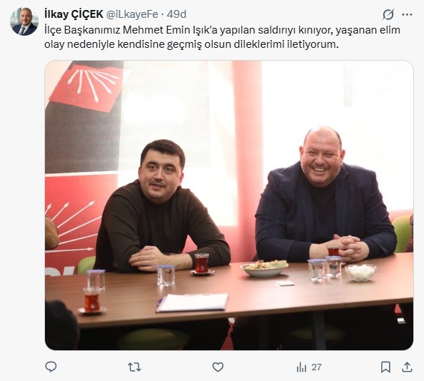 Menderes Belediye Başkanı İlkay Çiçek, sosyal medya hesabından yaptığı paylaşımda Işık'a yapılan saldırıyı kınayarak  "İlçe Başkanımız Mehmet Emin Işık'a yapılan saldırıyı kınıyor, yaşanan elim olay nedeniyle kendisine geçmiş olsun dileklerimi iletiyorum" ifadelerini kullandı.