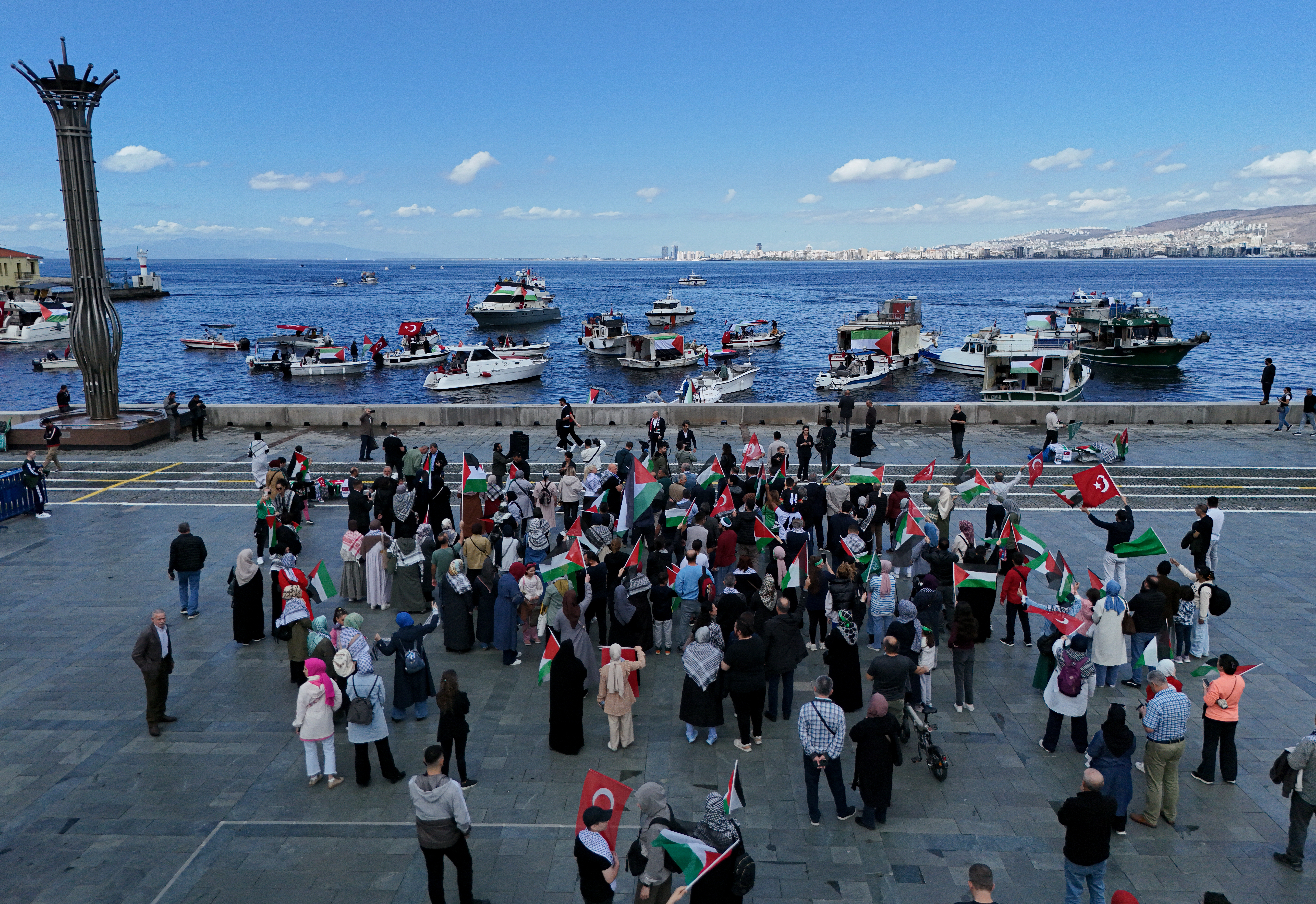 Filistin'e Destek Platformu tarafından organize edilen etkinlik kapsamında Bostanlı, Güzelbahçe, Sahilevleri, İnciraltı ve Mavişehir'deki balıkçı barınaklarından hareket eden tekneler Cumhuriyet Meydanı önünde buluştu.