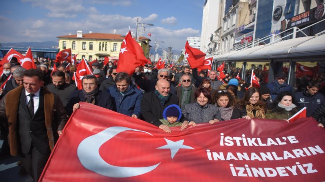 ?Yürüyüşün sonunda Konak Atatürk Meydanı'nda açıklama yapan İzmir Büyükşehir Belediye Başkanı Tunç Soyer, "İstiklal Marşı, esaret altına alınmak istenen bu vatanın umudu oldu. Emperyalizme karşı mücadele eden bir vatanın sembolü oldu. İstiklal Marşımız hürriyetin her şeyden kıymetli olduğunu ve en güçlü direnişin bağımsızlık için olduğunu anlatır. 'Korkma' diyerek başlar. Bağımsızlığımızı savunmaktan, bu cennet vatanı korumaktan, cennet doğasına sahip çıkmaktan, zeytin ağaçlarına sahip çıkmaktan korkmadık, korkmuyoruz" dedi. (DHA)