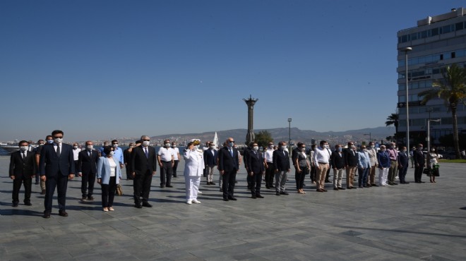 Cumhuriyet Meydanı’nda başlayan törende, Atatürk Anıtı’na çelenk bırakıldı ve bir dakikalık saygı duruşunda bulunuldu. Ardından İzmir Körfezi’ne deniz şehitlerinin anısına Pasaport İskelesi’ndeki Zübeyde Hanım Müze Ve Eğitim Gemisi’nden çelenk atıldı. Törene İZDENİZ’e ait yolcu vapurları ile Kıyı Emniyeti ve deniz polisi tekneleri de siren çalarak eşlik etti.