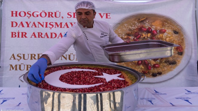 İzmir Büyükşehir Belediyesi, birlik, beraberlik ve kardeşlik duygularının pekiştiği, sevgi, hoşgörü ve paylaşmanın simgesi olan Muharrem ayında üç ilçede aşure dağıttı. Sosyal Hizmetler Dairesi Başkanlığı Aşevleri Şube Müdürlüğü tarafından özenle hazırlanan 10 bin kişilik aşure, Konak Atatürk Meydanı, Karşıyaka Vapur İskelesi ve Buca Şirinyer Meydanı’nda yurttaşlara ikram edildi. Konak Atatürk Meydanı’ndaki ilk aşure dağıtımına İzmir Büyükşehir Belediyesi Genel Sekreter Yardımcısı Prof. Dr. Pınar Okyay, İzmir Büyükşehir Belediyesi Sosyal Hizmetler Dairesi Başkanı Ela Hızlı ve Muhtarlık İşleri Dairesi Başkanı Serpil Keskin de katıldı. İzmir Büyükşehir Belediyesi aşçılarının rengarenk meyve ve kuru yemişlerle süsledikleri aşureler yurttaşlara ikram edildi. Vatandaşlar aşure kazanlarında oluşturulan ay yıldızlı Türk bayrağı görüntüsünün fotoğrafını çekti.