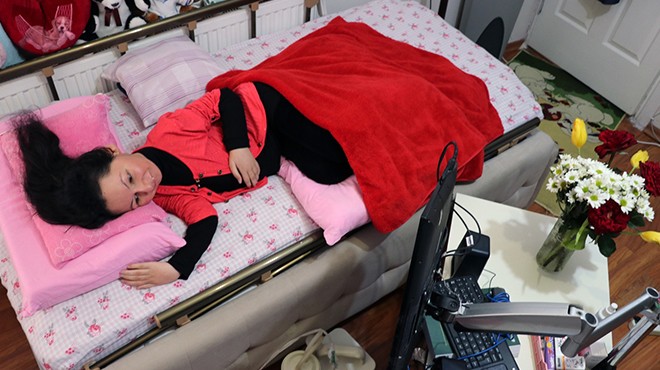 Evde annesinin bakımına muhtaç olan, mide tüpüyle beslenen ve yatağa bağımlı yaşayan yüzde 98 bedensel engelli Özkan, memurluğu, evinde gözleriyle kullandığı bilgisayarının başında yapmak istiyor.
