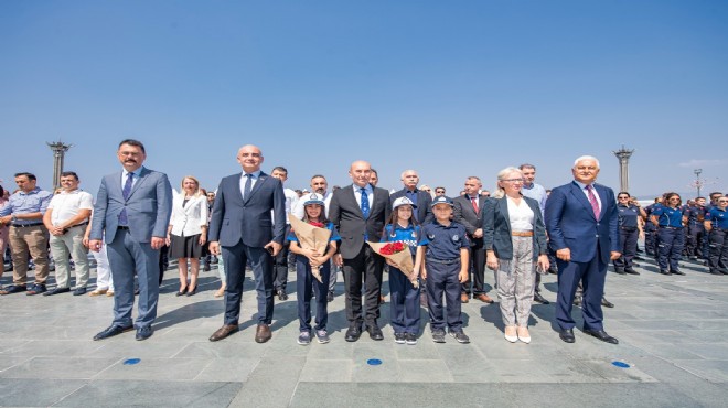 Başkan Soyer, zabıta memurları Ebru Boran Atılgan’ın oğlu Burak, Ebru Evin’in kızı Elara ve Hüseyin Kaygısız’ın kızı Duru ile Atatürk Anıtı'na çelenk bıraktı.