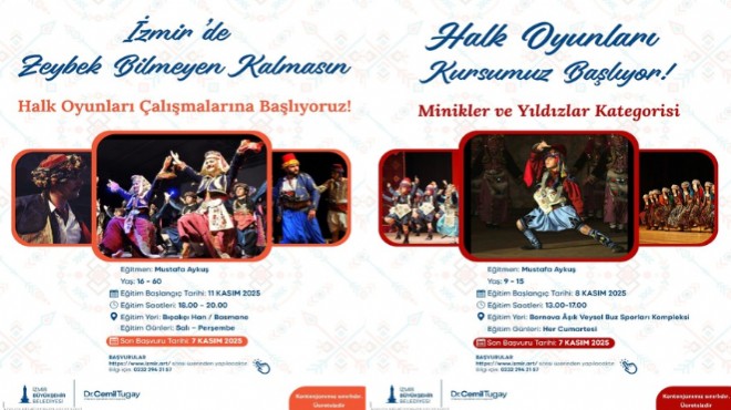 İzmir Büyükşehir Belediyesi, halk oyunları kursları açıyor. Minikler ve Yıldızlar kategorilerinde Halk Oyunları Kursu ile zeybek eğitimlerinin verileceği genç ve yetişkinlere yönelik Halk Oyunları Çalışmaları başlayacak. Her iki kursun son başvuru tarihi ise 7 Kasım olarak belirlendi. Ücretsiz gerçekleştirilecek çalışmalara başvuru yapmak için https://www.izmir.art/ sitesi ziyaret edilebilir. Detaylı bilgi için 0232 294 21 57 numaralı telefon aranabiliyor.