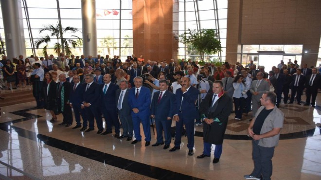 Adliye A- Protokol Kapısı girişinde yapılan 2017- 2018 yılı adli yıl açılışı törenine İzmir Cumhuriyet Başsavcısı Mustafa Doğru, İzmir Bölge İdare Mahkemesi Başkanı Ali Telli, İzmir Barosu Başkanı Aydın Özcan, İzmir Adli Yargı Komisyon Başkanı İbrahim Korkmaz, hakim, savcı ve avukatlar katıldı. Atatürk Anıtı'na çelenk konulmasının ardından, saygı duruşunda bulunuldu ve İstiklal Marşı okundu. Daha sonra tören adliye içinde devam etti. Törende ilk konuşmayı İzmir Barosu Başkanı Özcan yaptı. Darbe girişiminin ardından yaşanan OHAL sürecine değinen Özcan, şunları söyledi: