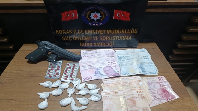 İzmir'in Konak ilçesinde yapılan asayiş uygulamasında bir miktar uyuşturucu madde ile 6 tabanca ele geçirildi, suça karıştığı belirlenen 14 kişi gözaltına alındı.