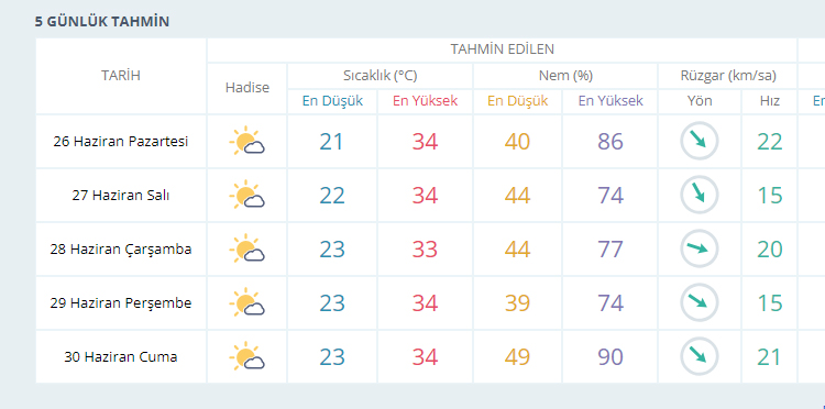 Kentte herhangi bir yağış beklenmeyen yeni haftada en yüksek sıcaklıklar 34 derece bareminde seyredecek. Nem oranının zaman zaman yüzde 40'ın altına düşeceği 5 günlük periyotta rüzgarların ise genellikle kuzeybatıdan etkili olması bekleniyor.