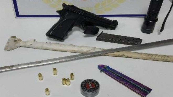 Bayraklı İlçe Emniyet Müdürlüğü ekipleri, uyuşturucu madde ve silah bulundurulduğuna ilişkin 112 Acil Çağrı Merkezi'ne yapılan ihbar üzerine Çay Mahallesi'ndeki bir berber dükkanına baskın yaptı. Savcılık talimatı ile ATV'li polis ekiplerinin berber dükkanında yaptığı aramada bir miktar yeşil reçeteye tabi sentetik hap, esrar öğütücü ve esrar maddesi ile 1 ruhsatsız tabanca, şarjör, 6 fişek, kasatura, kelebek olarak tabir edilen bıçak ve çalışır vaziyette elektro şok cihazı ele geçirildi. İş yerinde bulunan bir kişi gözaltına alındı. Olayla ilgili incelemeler sürdürülüyor. (DHA)
