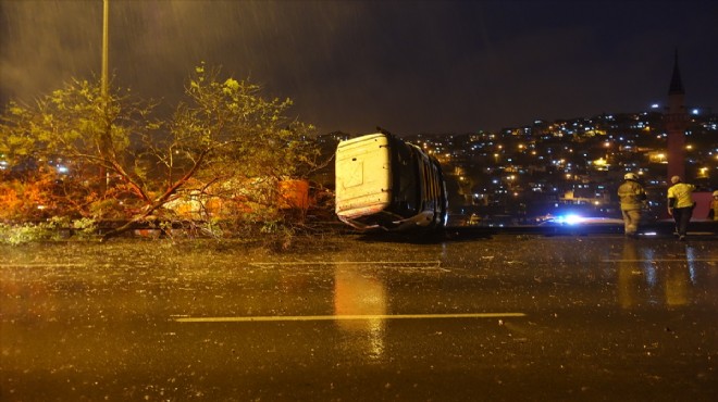 Konak'tan Karabağlar yönüne giden Şükrü Öz yönetimindeki 35 U 6569 plakalı beton mikseri, Yeşildere Caddesi'nde yağış nedeniyle kayganlaşan yolda refüje devrildi.