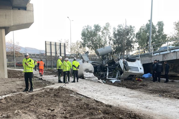 Eyüp Taşyuran'ın (35) kullandığı 35 AAD 871 plakalı beton mikseri, İzmir-Karşıyaka Çevreyolu Ege Üniversitesi katılım viyadüğünde bariyerleri aşarak zemine düştü.