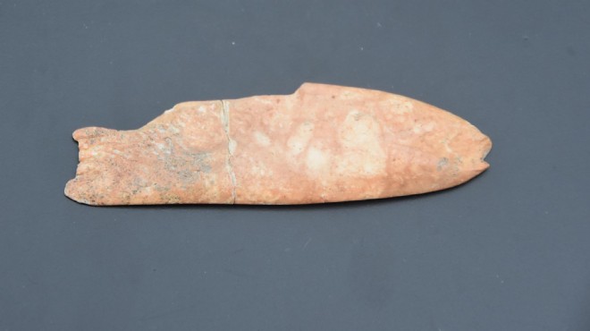 Buluntu hakkında bilgi veren Doç. Dr. Derin, "İlk Egeliler, denize yönelik yaşamış bir kültür. Balık ve midye gibi deniz canlılarıyla ilişkililer. Buluntumuz da denizle suyla ve balıkla ilgili. O dönemin insanları balık temizlemek için çeşitli aletler kullanmıştı. Biz de o döneme ait böyle bir alet bulduk. Balık temizlemek için kullanılan, kemikten yapılmış ve balık şeklinde bir spatula bu. Üzerinde balık pullarını temizlerken oluşan izleri görebiliyoruz. İlk İzmirlilerin basit bir aleti bile yaşamlarına uygun bir şekilde sanatsal bir hale dönüştürdüklerini görüyoruz. 15 santimetre uzunluğundaki bu aletin yapımında büyük ya da küçükbaş hayvan kemiğinin kullanıldığını görüyoruz" diye konuştu. (DHA)