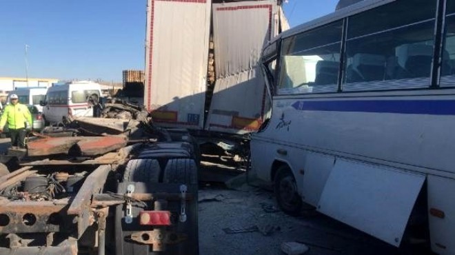 Kaza, saat 15.30 sıralarında, Ankara Asfaltı Turgutlu-İzmir yolu Armutlu Kavşağı'nda meydana geldi. İzmir'den Turgutlu yönüne giden tavuk kesimhanesine işçi taşıyan Serkan Dinçtürk'ün kullandığı 45 J 6319 plakalı servis midibüsü, Fayık Kaya yönetimindeki 35 PPJ 57 plakalı TIR ve Burhan Ahmet Koyuncu'nun kullandığı 09 FV 207 plakalı TIR ile çarpıştı.