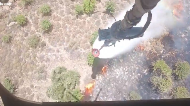 Çeşme ilçesi Alaçatı mevkisinde saat 14.10'da ormanda alanda çıkan yangına 2 helikopter, 8 arazöz, 1 su ikmal aracı, 1 dozer ve 1 yer ekibi ile müdahale edilirken, alevler saat 15.41'de kontrol altına alındı.