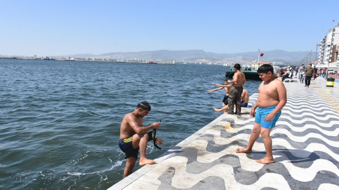 İzmir'de hava sıcaklıklarının artmasıyla birlikte çocuklar Konak ilçesindeki Pasaport sahilinden denize girdi.