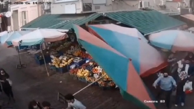 Deprem anı, pazaryerindeki MOBESE kamerasına yansıdı. Görüntülerde tezgahaların üzerindeki şemsiyeler sallanıyor, vatandaşlar korkuyla sağa sola kaçıyor. (DHA)