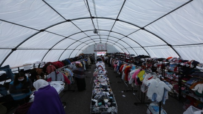 Merkez üssü İzmir'in Seferihisar ilçesi açıklarında meydana gelen 6.6 büyüklüğündeki depremin ardından Türkiye tek yürek oldu. Türkiye'nin dört bir yanından toplanan yardım malzemeleri, İzmir'in farklı noktalarında kurulan çadır kentlere gönderildi. Yardımlar, Aşık Veysel Rekreasyon Alanı'nda kurulan 'Sosyal market' aracılığıyla depremzedelere dağıtılıyor. (DHA)