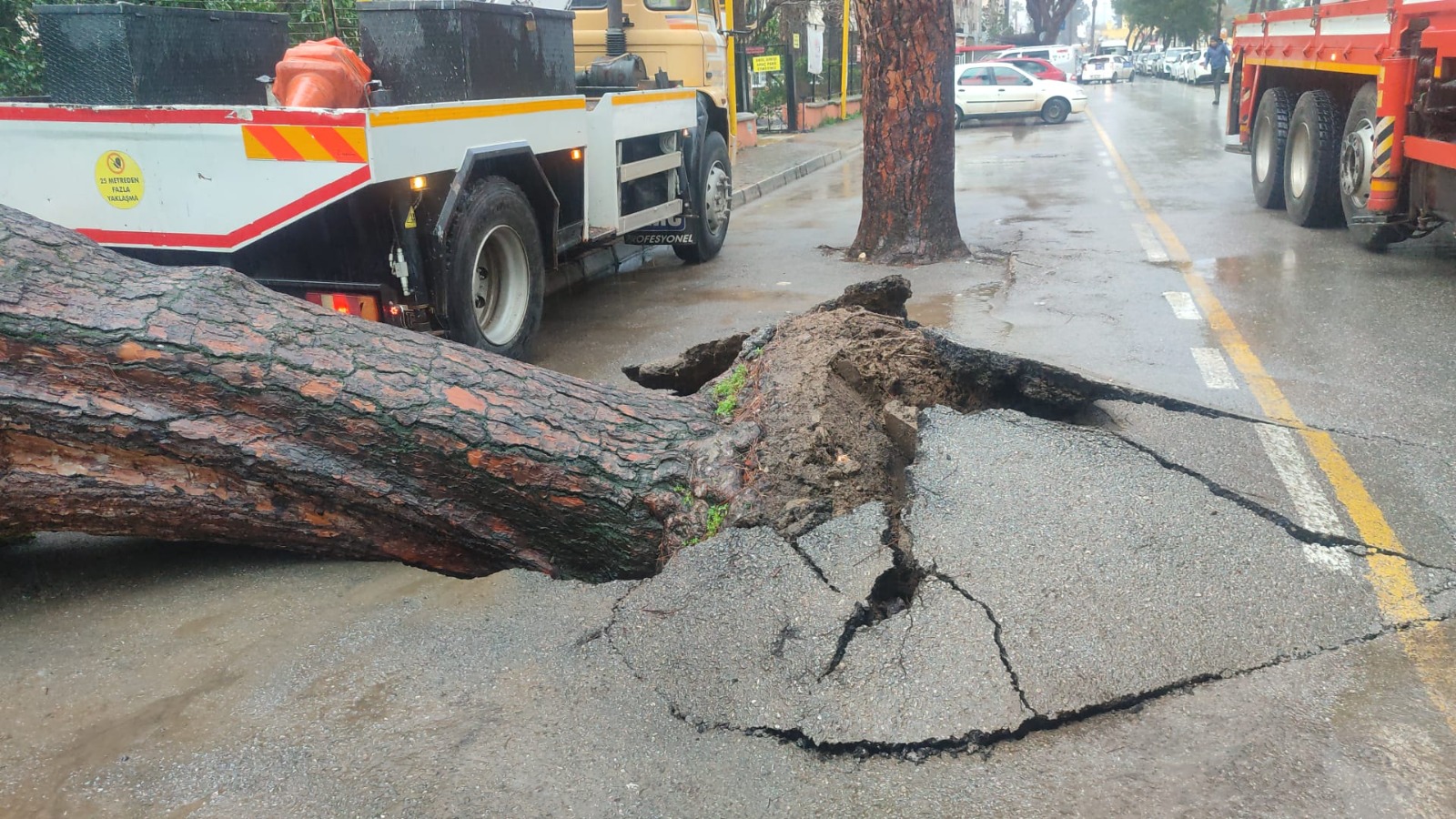 İlçede aralıklarla etkili olan sağanakta Atatürk Mahallesi Ulus Meydanı'ndaki bir çam ağacı, Ödemiş Mesleki ve Teknik Anadolu Lisesi'nin bahçe duvarına devrildi.