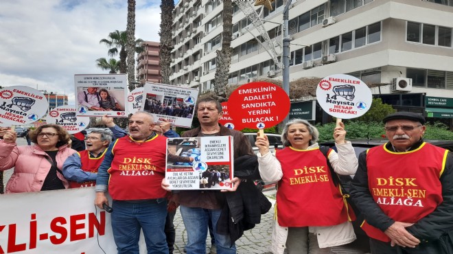 GERÇEKİZMİR - DİSK Emekli-Sen İzmir Şubeleri, “Emekliler yoksullukta değil, refahta eşitlensin” diyerek alana indi. Konak’taki eski Sümer Bank önünde bir araya gelen üyeler, “Saraya değil emekliye bütçe”, “Patates soğan güle güle Erdoğan” ve “Açlığa yoksulluğa oy yok” sloganları attı.