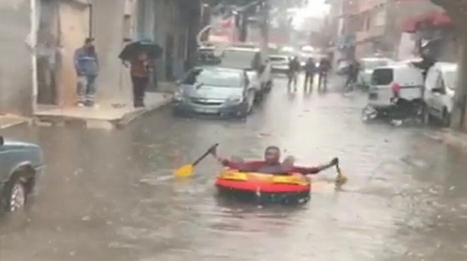 İzmir'de aralıksız süren sağanak nedeniyle cadde ve sokaklar su altında kalırken bu durumu eğlenceye dönüştürenler de oldu. Çamdibi Mahallesi'nde oturan bir kişi, şişirdiği lastik botla sokakta biriken suda kürek çekti. Mahalleli tarafından cep telefonuyla kaydedilen görüntülerde, suda botun içinde ellerinde kürek olan kişinin bu şekilde eğlendiği, diğer sokak sakinlerinin de onu izlediği görülüyor. (DHA)