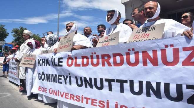 Taşeron işçilere kadro verilmesine yönelik çıkarılan Kanun Hükmünde Kararnameler (KHK) kapsamında, kadro alabilmek için güvenlik soruşturmasına girip geçemeyen ve işlerinden çıkmak zorunda kalan, bir kısmı DİSK'e bağlı Genel-İş 7 No'lu Şube'ye üye olan Tepecik Eğitim ve Araştırma Hastanesi ile Ege Üniversitesi işçileri, kefen giyip Mezarlıklar Dairesi Başkanlığı önünde buluştu. Eylemde bir işçi de cübbe ve sarık giyerek imam kılığına girdi.