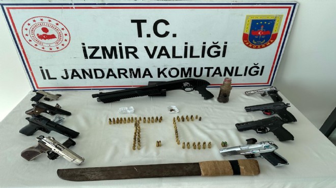 Aramada ruhsatsız 8 tabanca ve pompalı tüfek ile bu silahlara ait 83 fişek, pala, 2 gram kubar esrar ve uyuşturucu kullanma aparatı ele geçirdi.