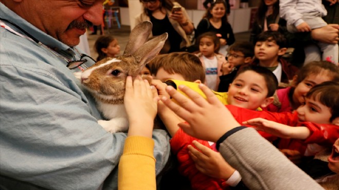 Kuş, balık ve tavşanları yakından görme imkanı bulan çocuklar hayvanlarla fotoğraf çektirdi.