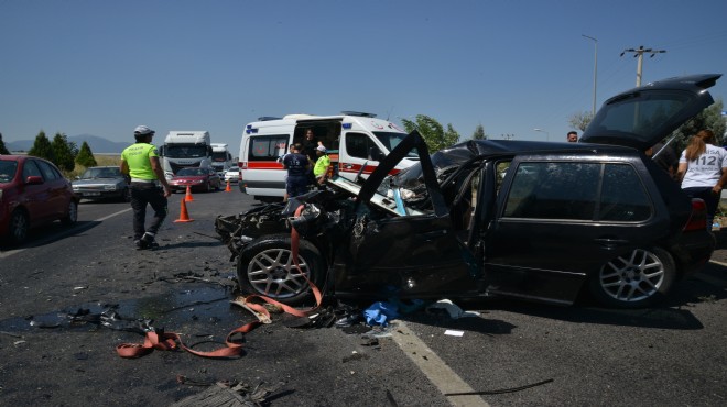 İzmir-Ankara kara yolu Bağyurdu mevkisi yakınlarında, Cevriye Soylu (33) idaresindeki 35 AJU 386 plakalı otomobil, karşı şeride geçtikten sonra Muharrem Evgin'in kullandığı 45 TA 580 plakalı kamyona yandan çarptı. Soylu yönetimindeki araç daha sonra Mustafa Kanat'ın kullandığı 35 CAL 69 plakalı otomobille çarpıştı.