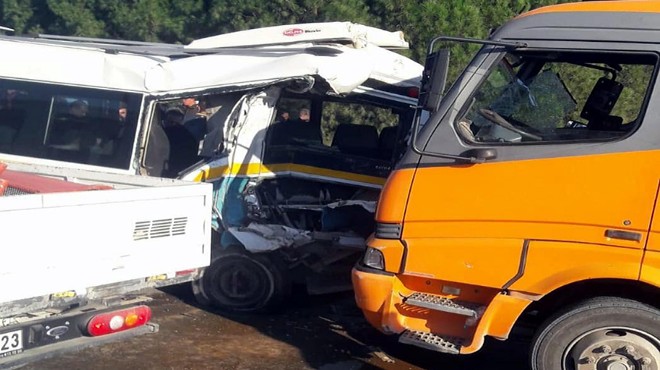 Kaza, Menderes'te, Atatürk Caddesi'nde meydana geldi. Kasasında iş makinesi olan İzmir Su ve Kanalizasyon İdaresi'ne (İZSU) ait 35 U 0991 plakalı kamyon, yolcu almak için yolun sağında duran 35 M 9511 plakalı minibüse arkadan çarptı. Kazada minibüste bulunan yolcular yaralandı.