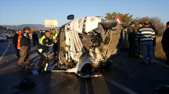 Alınan bilgiye göre, Kemalpaşa'dan İzmir istikametine giden Yakup Kösedağ idaresindeki 35 PCG 49 plakalı yolcu minibüsü, Kemalpaşa-İzmir karayolu 4. kilometrede, Furkan Ceylan'ın kullandığı 35 PEC 33 plakalı otomobil ile Mehmet İnci yönetimindeki 34 BSK 06 plakalı otomobille çarpıştı.