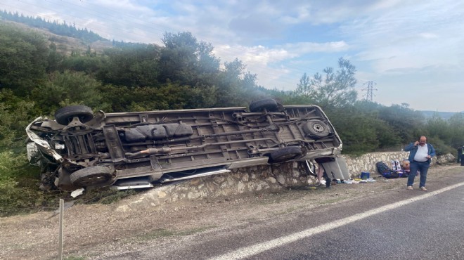 Aydın'ın Kuşadası ilçesinden Alman turistleri İzmir'deki Adnan Menderes Havalimanı'na götürmek için yola çıkan G.Ç. (53) yönetimindeki 09 AGN 162 plakalı minibüs, Menderes-Gümüldür kara yolunda devrildi.