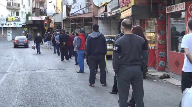 İzmir’de ramazan ayının ikinci gününde fırınların kapısında uzun pide kuyrukları oluştu. Maskeli vatandaşların birçoğu pide alırken sosyal mesafe kurallarına dikkat etti. Kural nedeniyle metrelerce kuyruklar oluştu. (DHA)