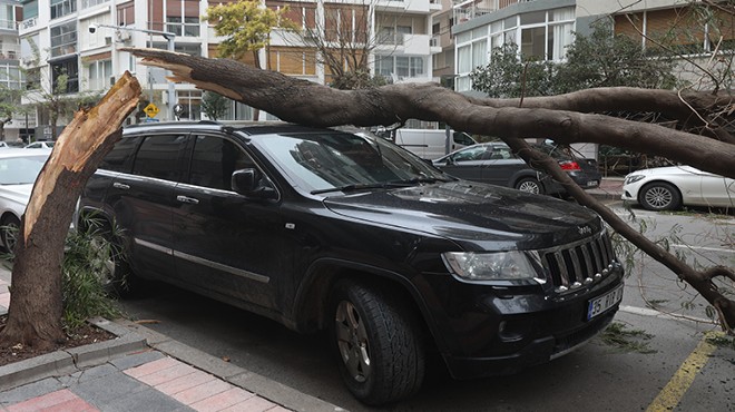 İzmir'de etkili olan kuvvetli rüzgar nedeniyle devrilen ağaçlar ve çatılardan düşen parçalar araçlarda hasara neden oldu, deniz ulaşımında aksama yaşandı.